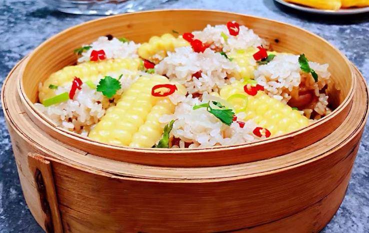 腌制后,排骨裹上糯米,放進蒸屜中,玉米放在排骨中間,入鍋蒸五十分鐘,至排骨變軟。