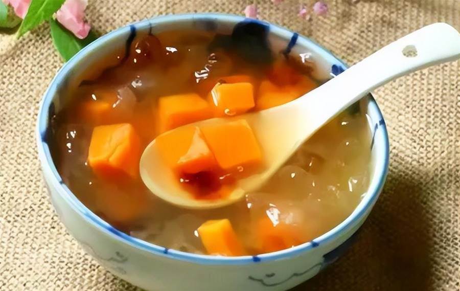 煮到銀耳變軟了,放入紅薯塊,還可以放幾顆紅棗進去,也可以放小圓子等。