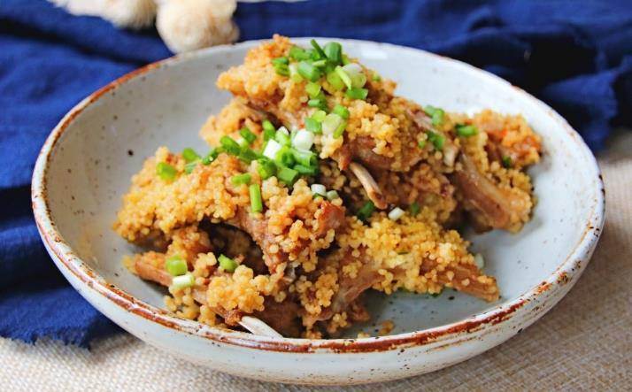 小米泡好了瀝水,再給羊排裹上小米,放進盤內,入鍋蒸到羊肉變軟。蒸好后,撒上蔥花,就可以食用了。